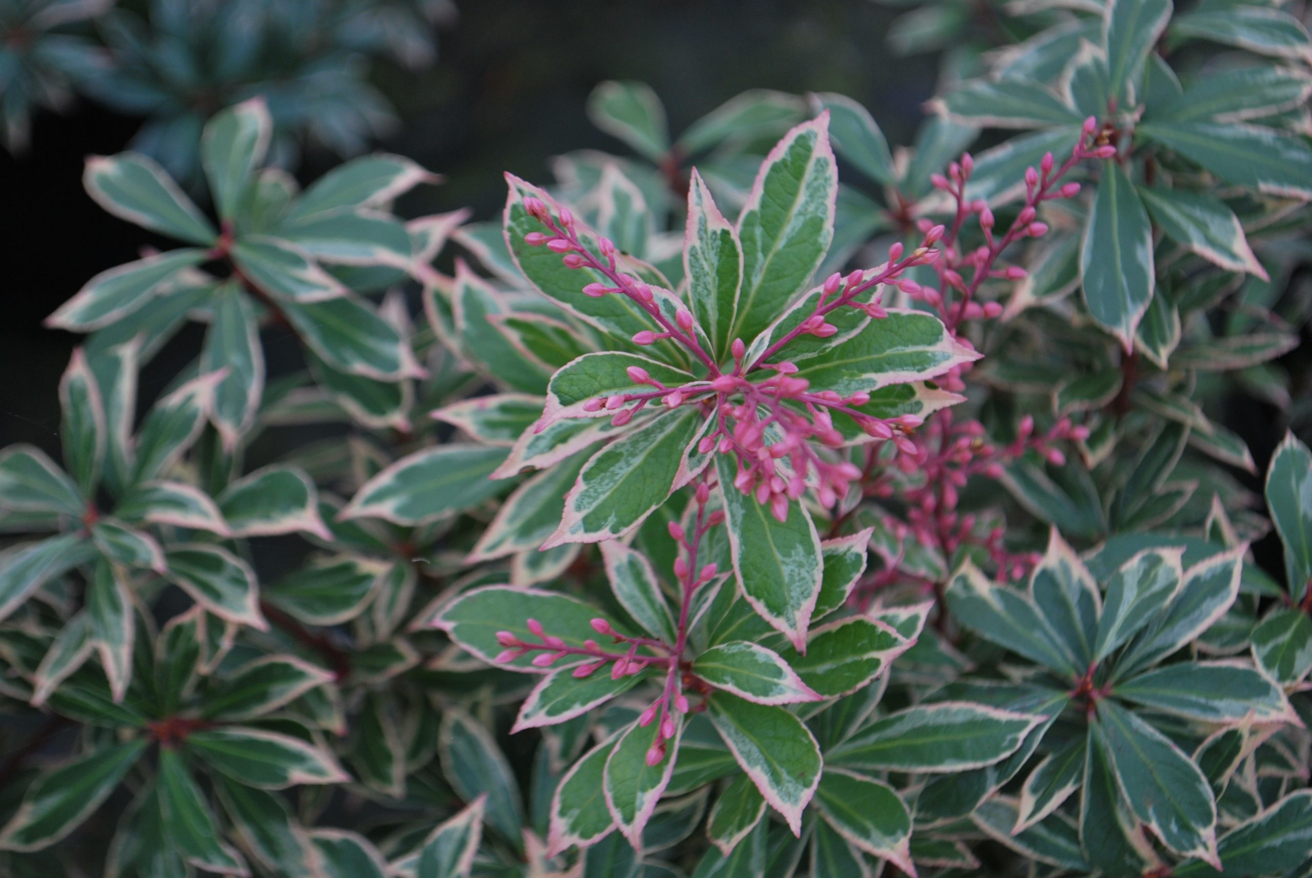 Pieris Little Heath, commonly known as Lily of the Valley shrub, is a charming evergreen shrub valued for its compact size and attractive foliage. This variety features a dense, rounded form with glossy, dark green leaves that display a soft, creamy-white edge, creating a subtle yet elegant variegation. The new growth emerges with a pink to reddish tint, adding a splash of colour to the plant. In early spring it produces clusters of small, bell-shaped flowers that hang delicately from the tips of the branches, providing a graceful contrast and attracting pollinators.